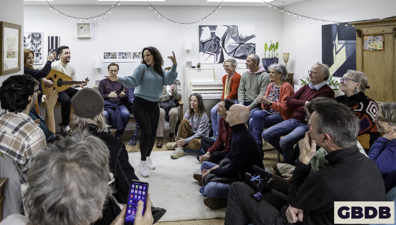 Een amateurkunstfestival in huiskamers op 31 januari 2027 voor de bewoners van Dieren. Het vloerkleed is het podium, de bank is de tribune.