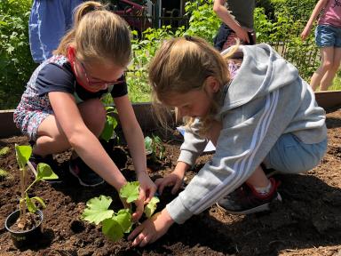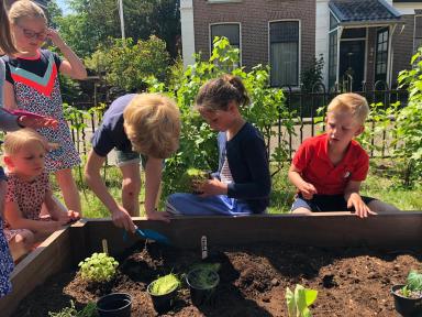 Met een groepje ouders hebben we op een ochtend 4m2 tuinaarde in de bakken geschept en toen kon het echte werk voor de kinderen beginnen. Met de klassen hebben ze plannen gemaakt voor wat er in de moestuinbak kon. Er is zelf een ouder in de middenbouw les komen geven over moestuinieren. Daarna hebben de klassen voorgezaaid in potjes in de school. Na een paar weken konden de plantjes overgezet worden in de moestuinbakken. En zie nu het resultaat! Alles groeit en bloeit! Er worden zelfs al salades gemaakt van de radijsjes en de sla uit de tuin en er zijn al heel wat aardbeien geproefd. De zonnebloemen gaan bijna bloeien.