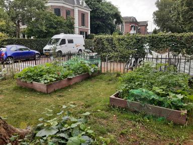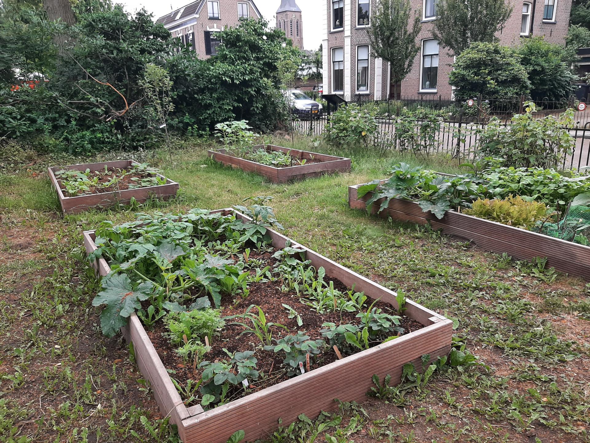 Nadat een aantal ouders het stuk gemaaid heeft, hebben zij prachtige degelijke moestuinbakken in elkaar gezet. Niet de kant-en-klare moestuinbakken van een tuincentrum zoals we eerst voor ogen hadden, maar mooie, grote, handgemaakte, hardhouten bakken, die jaren mee kunnen! Elke groep heeft zijn eigen moestuinbak.