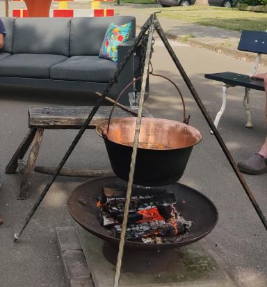In het midden staat een driepoot met een grote koperen pan waarin Ayeja een heerlijke soep heeft gemaakt. Met de meegenomen hapjes en drankjes (vooral veel water) wordt het een geslaagde middag waar jong en oud zich prima hebben vermaakt.