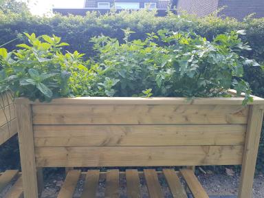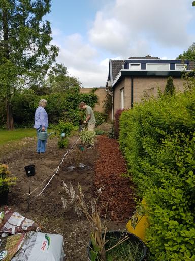 In april werden de vier kweekbakken aangeschaft. In de vakantieweek in mei werden de bakken gevuld. Daarnaast lieten we een groot stuk gras weghalen en maakten er een nieuw bloembed. Er werd mest gekocht en die werd door de aarde heen gewerkt. Het bloembed werd gevuld met allerlei soorten inheemse planten.