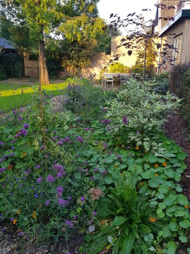 De helft met planten die bloemen gaan leveren die we volgend jaar op vaas kunnen zetten. Daardoor hoeven we geen bloemen meer te kopen bij de supermarkten die bovendien vaak nog met gebruik van bestrijdingsmiddelen gekweekt zijn.