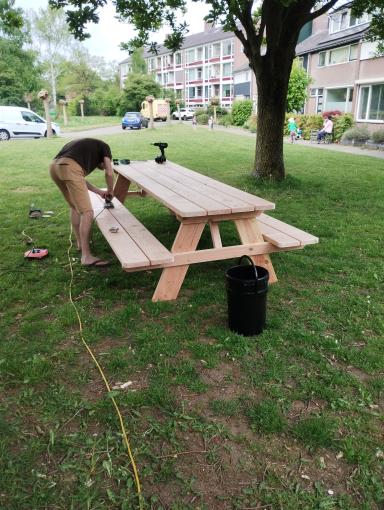 Ondertussen met de gemeente contact zoeken voor het plaatsen van een object in de openbare ruimte. Deze waren redelijk makkelijk te overtuigen van mijn goede bedoelingen. Daarna de buurt in om ideeën betreffende de vormgeving van de tafel te vragen. Welk hout, welke vorm, zelf bouwen, laten bezorgen? Allerlei vragen werden opgeworpen. Het bleek al snel dat we voor een mooie luxe of een tafel gemaakt door een sociale werkplaats te weinig geld hadden aangevraagd. (Tip 1. Zorg voor een realistische begroting) Dan met met iets minder genoegen nemen en er zelf nog wat aan klussen. Na wat wikken en wegen een tafel besteld. Ondertussen bleek dat toch niet iedereen het in de buurt helemaal eens was met de tafel. Er was vooral angst voor hangjeugd die gebruik zou gaan maken van de tafel. (Tip 2. Informeer de hele buurt van je plannen, niet alleen mensen die actief meedoen met je plan.) De tafel kon nu opgehaald worden, dus samen met een buurman eropuit. Karretje huren en gaan. Het was een bouwpakket, dus bij terugkomst konden we gelijk aan de slag. Het resultaat mag er wezen.